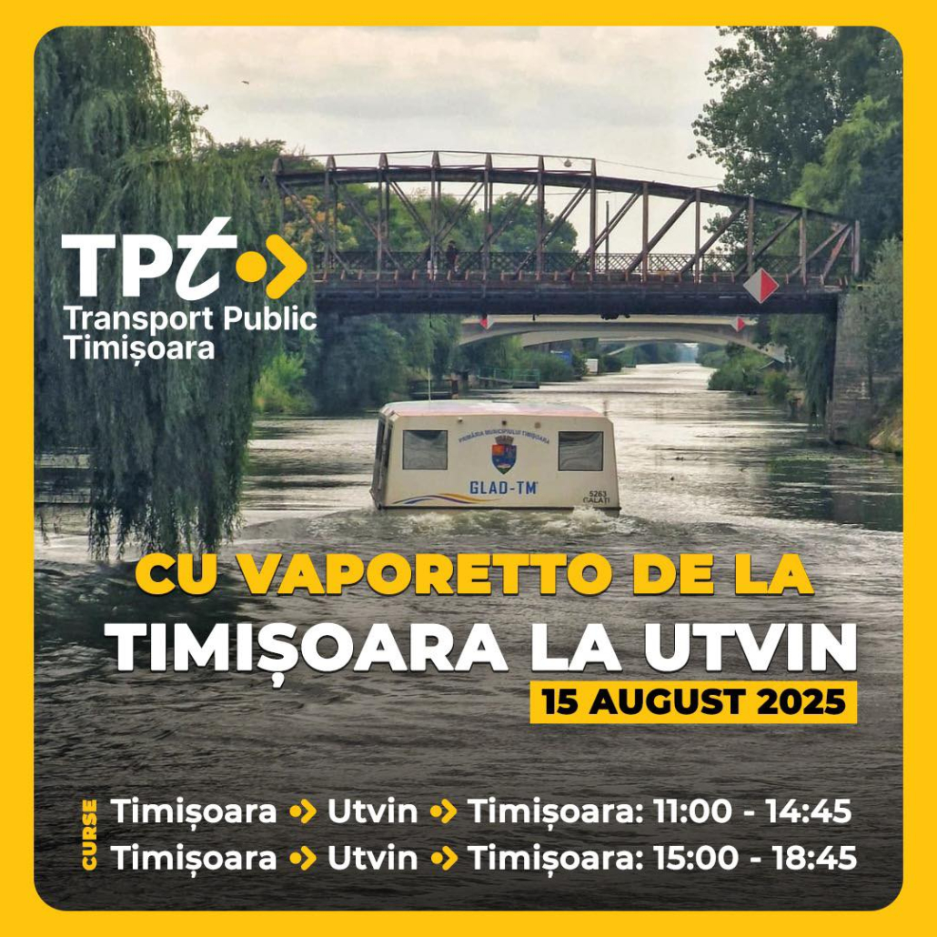 Pe 15 august 2025, iubitorii de plimbări pe apă au ocazia să descopere o nouă rută pe Bega: din Timișoara până la Utvin, la bordul vaporașelor Societății de Transport Public Timișoara (STPT).