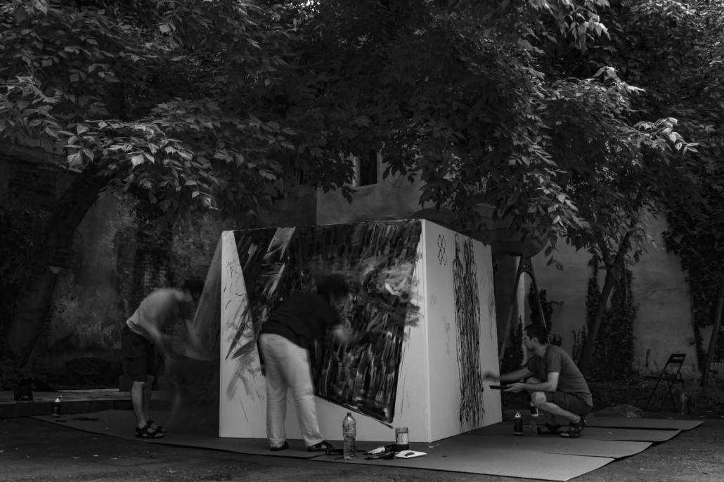 CURTEA este un „platou de filmare” simbolic, un spațiu delimitat, în care 9 autori – 4 pictori, 2 fotografi, 2 muzicieni și un regizor construiesc împreună o ficțiune vizuală, sonoră și conceptuală.